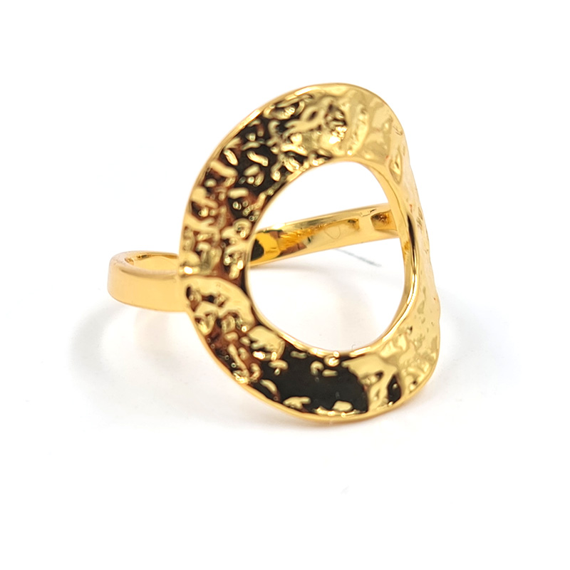 “Círculo de Luz” es un anillo de diseño redondo y texturizado, con detalles que reflejan la eternidad y el equilibrio. Su acabado dorado y su estructura llamativa lo convierten en una pieza versátil