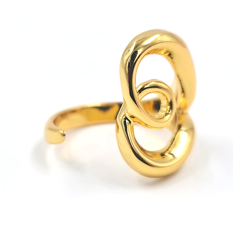 Un anillo dorado con forma de corazón estilizado y un detalle en espiral.