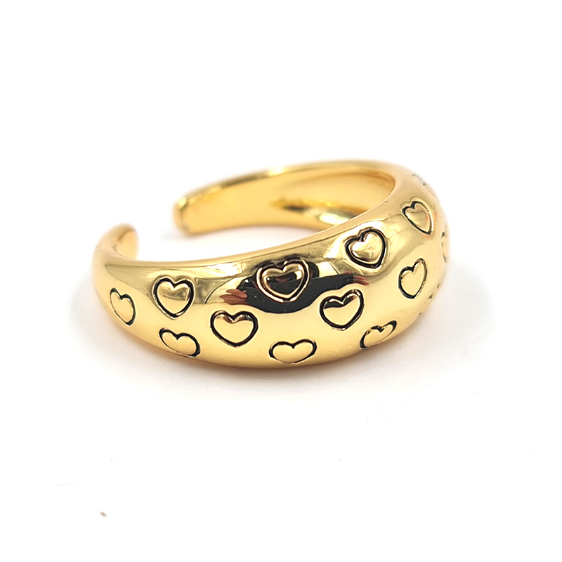 Anillo de acabado dorado con un diseño de corazones en contraste negro que le aporta un estilo sofisticado y moderno. Su estructura ancha lo convierte en una pieza llamativa, ideal para quienes buscan accesorios con personalidad y un toque artístico.