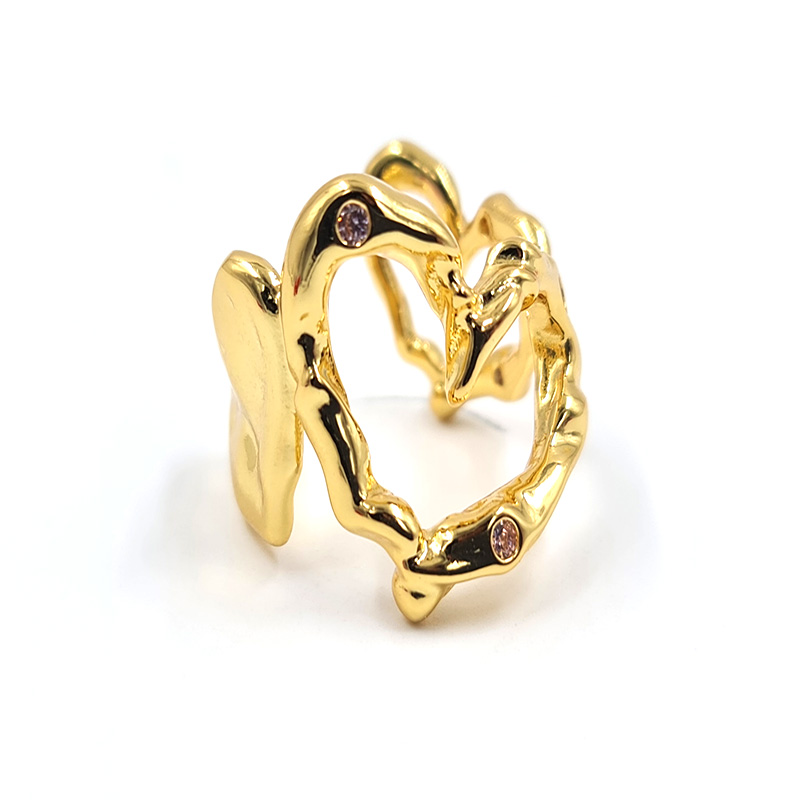 Este anillo combina un diseño artesanal. Su estructura irregular en tono dorado le da un aire vintage y romántico, ideal para quienes buscan una joya con personalidad.
