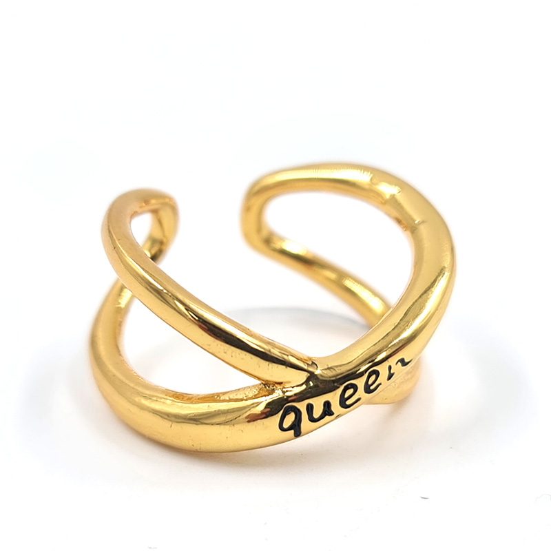 Este elegante anillo dorado presenta un diseño en forma cruzada, decorado, que aportan un toque de sofisticación y simbolismo.