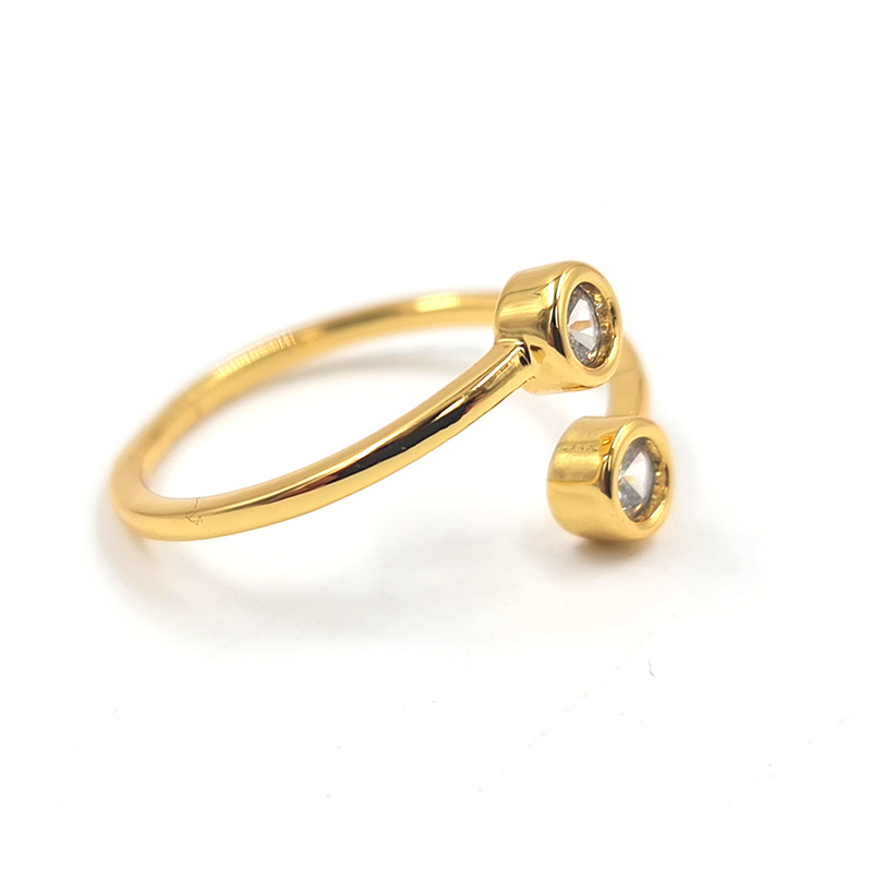 Un diseño moderno y delicado caracteriza este anillo dorado abierto, decorado con dos piedras brillantes en cada extremo. Su estilo minimalista lo hace perfecto para usar solo o combinado con otras piezas