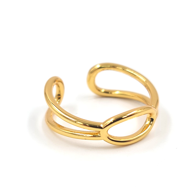Este anillo presenta un diseño sofisticado en forma de ovalo, elaborado en tono dorado brillante. Su estructura entrelazada le otorga un toque de elegancia y estilo,