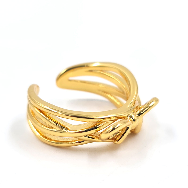 Este anillo dorado se distingue por su estructura entrelazada en forma de lazo, aportando un estilo único y refinado. Su diseño detallado y su acabado brillante lo convierten en un accesorio perfecto para ocasiones especiales