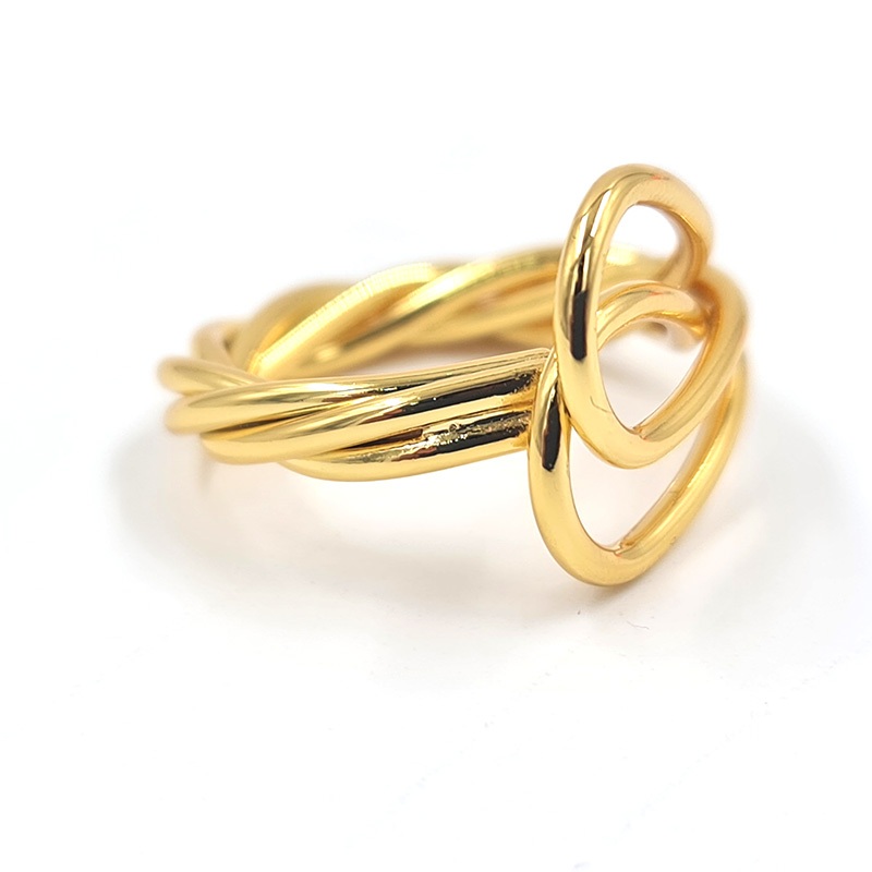 Este anillo presenta un diseño moderno y fluido con líneas doradas entrelazadas que evocan la caída de una gota de agua. Su estructura abierta y ligera lo convierte en un accesorio sofisticado y versátil