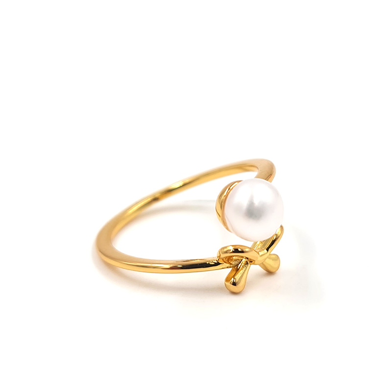 Anillo dorado con mariposa y detalle de perla.
