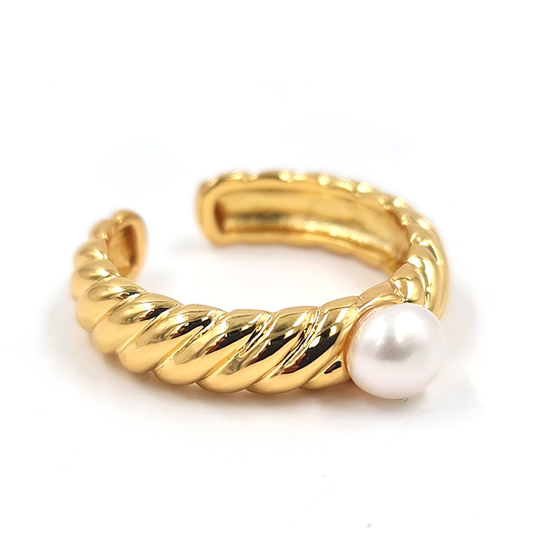 Anillo dorado de textura orgánica con perla blanca central.