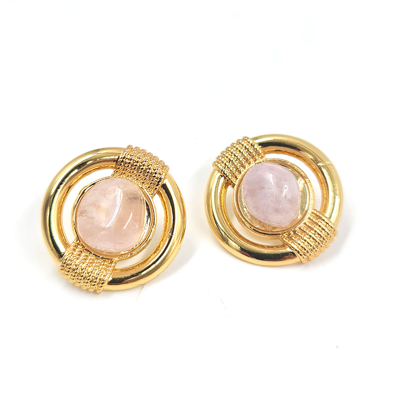 Este aro combina lujo y simbolismo en un diseño armonioso. Su estructura dorada presenta un marco de aros entrelazados que rodea una piedra central translúcida, posiblemente cuarzo rosa, aportando un aire de suavidad y misticismo.