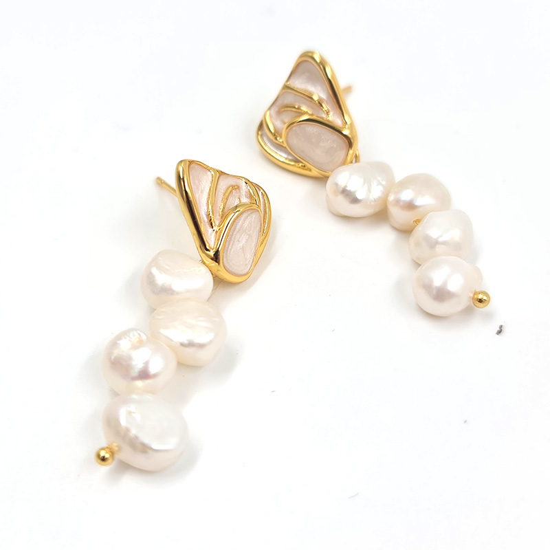Aretes sofisticados con perlas dispuestas en caída tipo cascada, sujetas a una base metálica con un diseño moderno. Un accesorio ideal para ocasiones especiales o para añadir un toque refinado a cualquier atuendo.