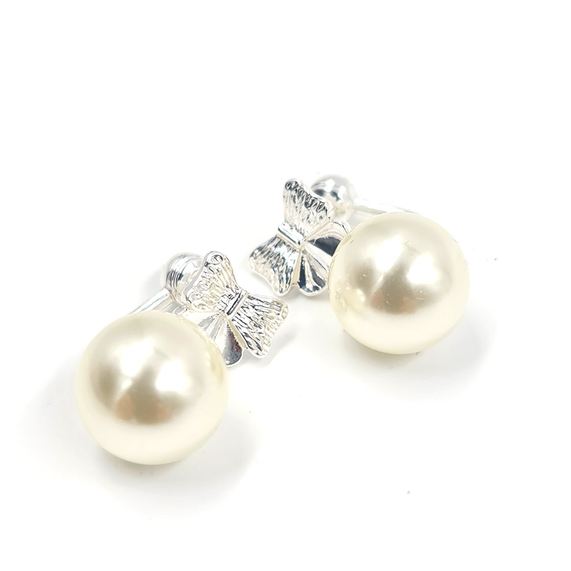 Hermosos aretes con perlas brillantes, acompañados de un elegante detalle de moño en tono plateado. Su diseño aporta un toque femenino y sofisticado, ideal para quienes buscan un accesorio con encanto y delicado