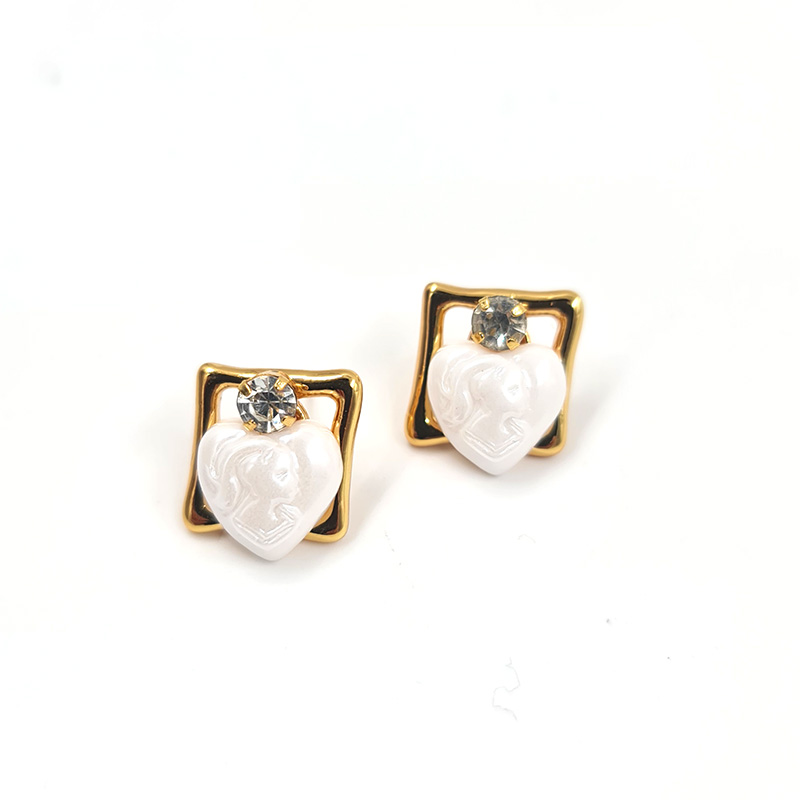 Un diseño sutil y elegante, estos aretes cuentan con un corazón en tono blanco con un marco dorado que resalta su forma. Son ideales para un look romántico y femenino, combinando fácilmente con cualquier atuendo.