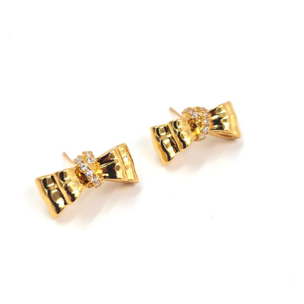 Sofisticados y femeninos, estos aretes tienen un diseño en forma de lazo en tono dorado, decorado con pequeñas piedras brillantes que aportan un toque de glamour. Son una opción perfecta para complementar un outfit elegante y refinado.