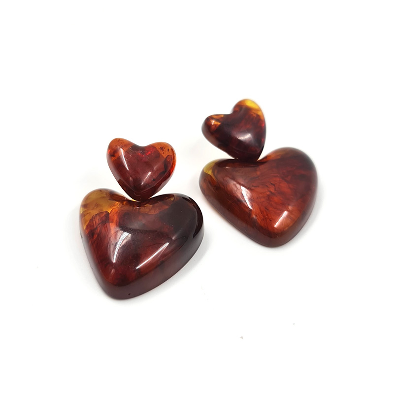 Aretes de doble corazón con un acabado translúcido y tonalidades cálidas que reflejan la luz de manera sutil.