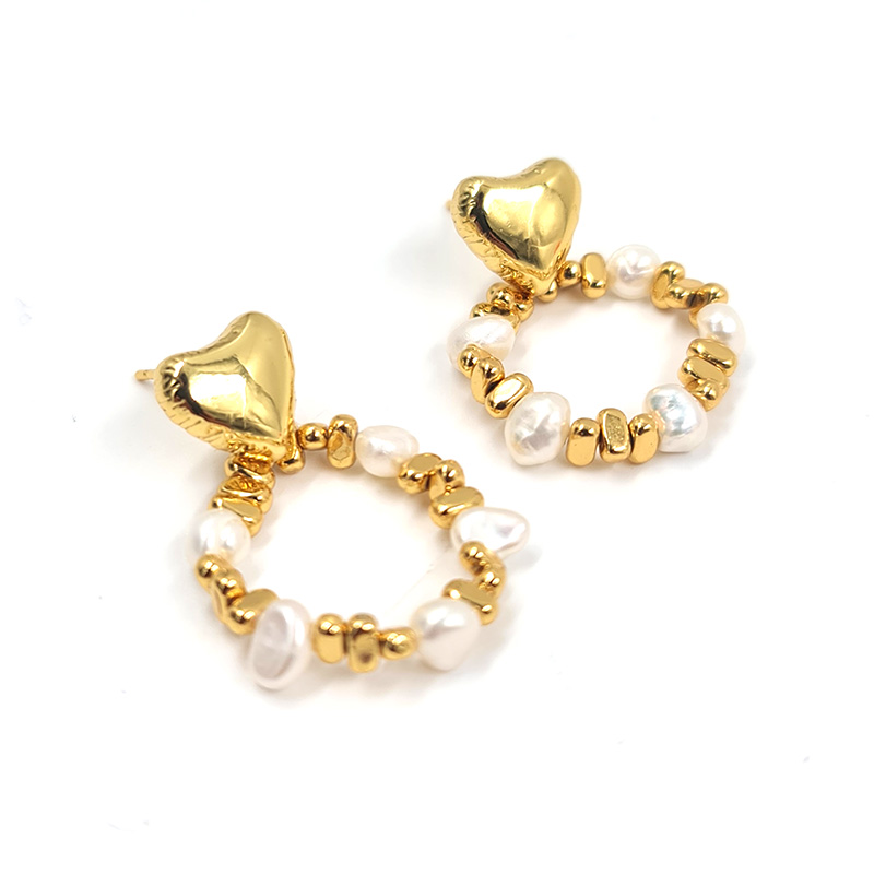 Su diseño en aro, elaborado con cuentas doradas y perlas, resalta la belleza natural de los materiales, mientras que el detalle del corazón en la parte superior aporta un toque romántico y femenino.