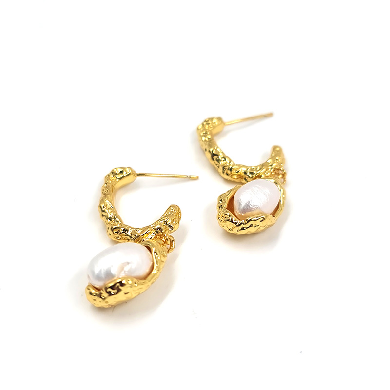 Aretes dorados con textura orgánica y detalle de perla en un diseño único y artístico.