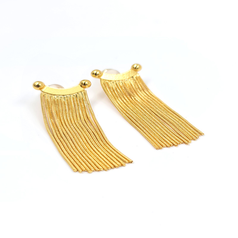 Estos llamativos aros están diseñados con múltiples cadenas doradas colgantes que aportan movimiento y brillo. Su estilo elegante y dinámico los convierte en el complemento perfecto para eventos nocturnos o looks glamorosos.