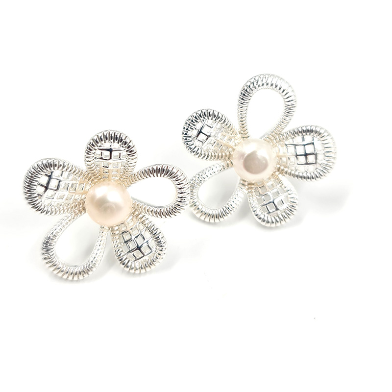 Aretes en forma de flor plateada con detalles transparentes que reflejan la luz de manera sutil.