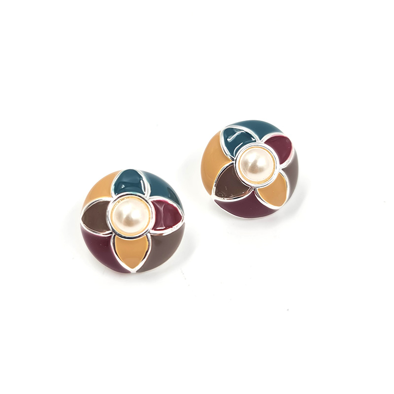 Estos hermosos aros destacan por su diseño floral detallado, combinando colores vibrantes como el verde y el naranja con toques dorados. Al centro, una perla aporta un toque sofisticado y clásico, creando un contraste armonioso con los colores cálidos.