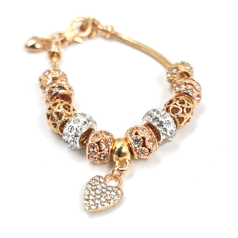 Pulsera estilo Pandora en tono dorado con dijes brillantes y elegantes detalles, ideal para resaltar tu look con un toque de glamour.
